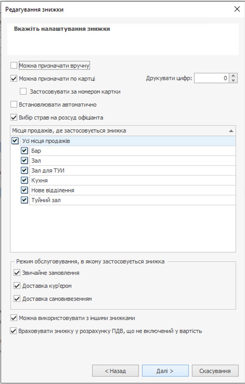 * В блоці "Режим обслуговування, в якому застосовується знижка" активуйте всі доступні режими обслуговування - "*Звичайне замовлення", "Доставка курʼєром", "Доставка самовивезенням"*