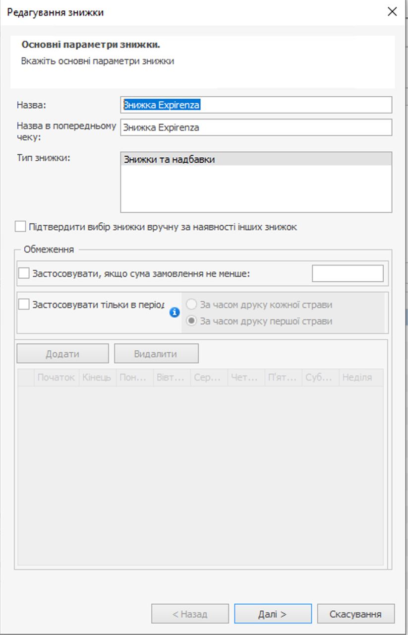 <figure><img src="https://115752690-files.gitbook.io/~/files/v0/b/gitbook-x-prod.appspot.com/o/spaces%2FUrrjxJkhEuwfb0dGwW06%2Fuploads%2FykmzkWGuZBDiKVkeKDbd%2Fphoto_4_2024-07-19_15-32-06.jpg?alt=media&#x26;token=6c98f5e8-99d4-4980-b749-69c4cb9dc354" alt="" width="375"><figcaption><p>Приклад налаштування кроку "Основні параметри знижки"</p></figcaption></figure>