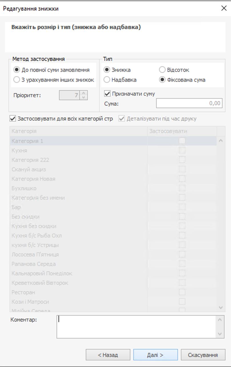 <figure><img src="https://115752690-files.gitbook.io/~/files/v0/b/gitbook-x-prod.appspot.com/o/spaces%2FUrrjxJkhEuwfb0dGwW06%2Fuploads%2FzQNpV9GiLsF2yQqpBNjM%2Fphoto_2_2024-07-19_15-32-06.jpg?alt=media&#x26;token=32695923-db95-4d8e-b52a-af04584672f0" alt="" width="375"><figcaption><p>Приклад налаштування кроку "Розмір і тип (знижка або надбавка)"ʼ</p></figcaption></figure>